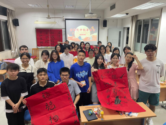随后各小组合力完成一幅字画,让浓浓相思与真挚祝福从笔尖流出,刻画在鲜艳的纸张里。“人间共赏中秋月,酒社诗家意味长。”从特色民族语言到传统诗词对联,从泼墨画竹到玉兔相聚,无不透露出对美好生活的希冀与祝福,辅导员们也加入创作之中,与同学们共同用横竖撇捺驱散孤独寂寞之感,一时间墨香四溢,令人倍感温馨。同时,承载着关怀与温暖的月饼也纷纷送至同学们手中,希望月饼的甜能驱散思乡的苦,为同学们留下美好的回忆。其后来自新疆同学精彩绝伦的民族舞表演更是淋漓尽致地展现了特色民族风情,让大家大饱眼福。