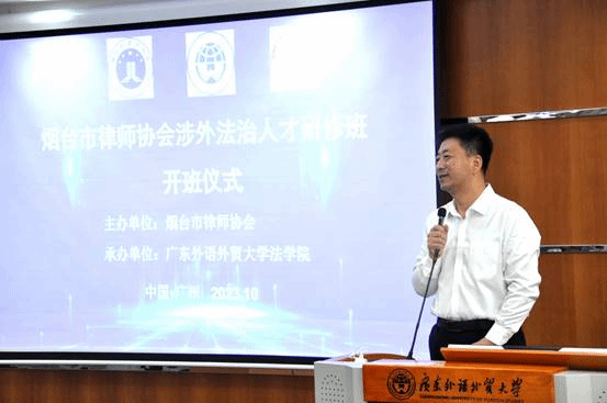 2023年10月23日,由烟台市律师协会主办、广东外语外贸大学法学院(广东涉外律师学院)承办的烟台市律师协会涉外法治人才研修班开班仪式在广东外语外贸大学白云山校区举行,来自山东省烟台市的35名涉外律师参加本次培训。山东省律师协会副会长杨希勇、烟台市律师协会副会长张克山、广外法学院党委书记杨敏生、法学院副院长韩永红、法学院副书记范聪等出席开班仪式。开班仪式由广外法学院副院长杨桦主持。