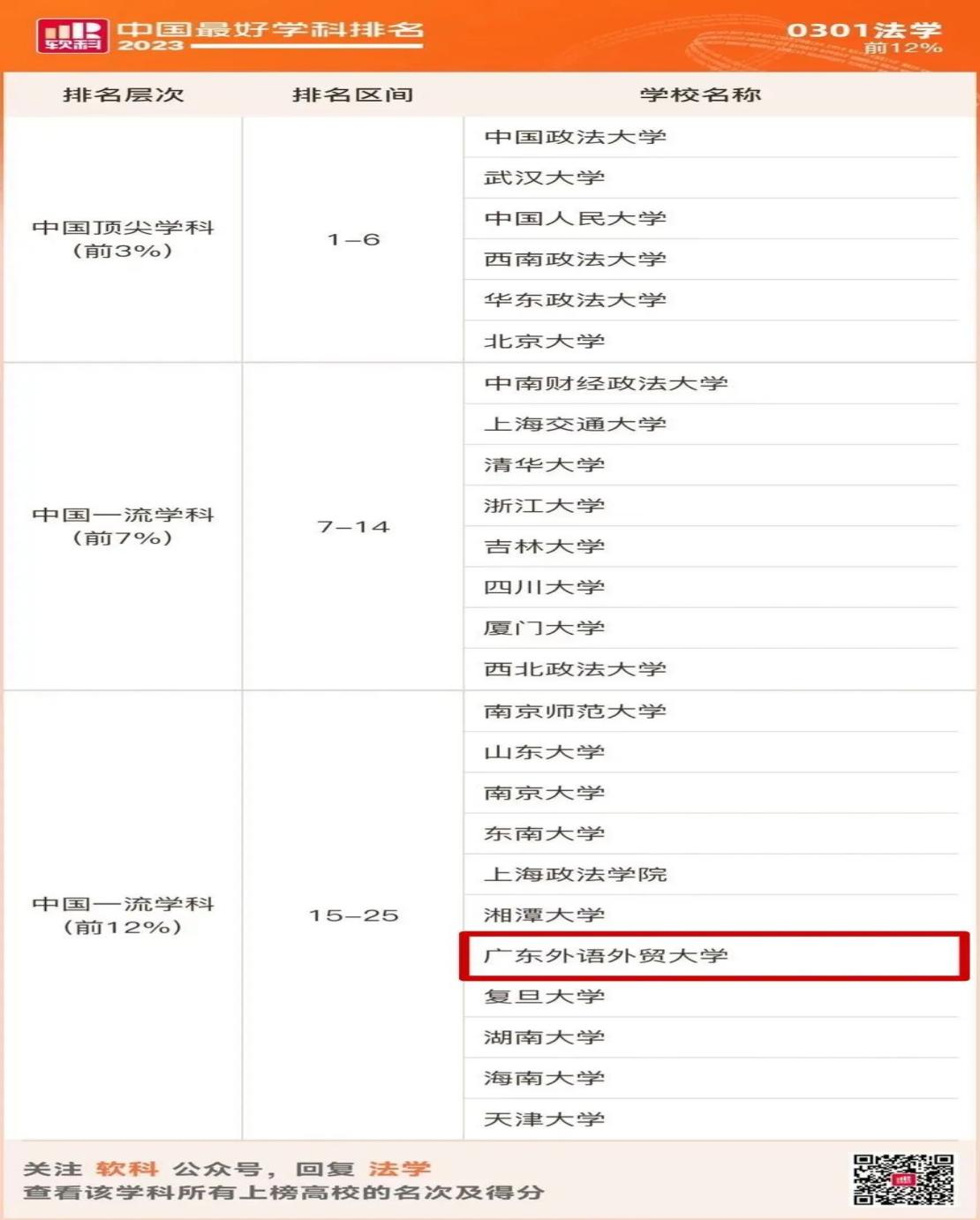 2023年,广外法学在软科中国法学学科中最好的排名是第19位,首次进入软科学科排名全国前9%,是广东唯一入选一流学科的法学学科;顺利开设教育部司法部培养项目——法律硕士专业学位(国际仲裁)研究生班;法律硕士新增“小语种+法学”方向;完成法律硕士专业学位(涉外律师)和涉外法治人才班招生。学院已发展成为国际化特色鲜明、学科体系完整、教学科研水平较高、在国内外有较大影响力的法学院。
