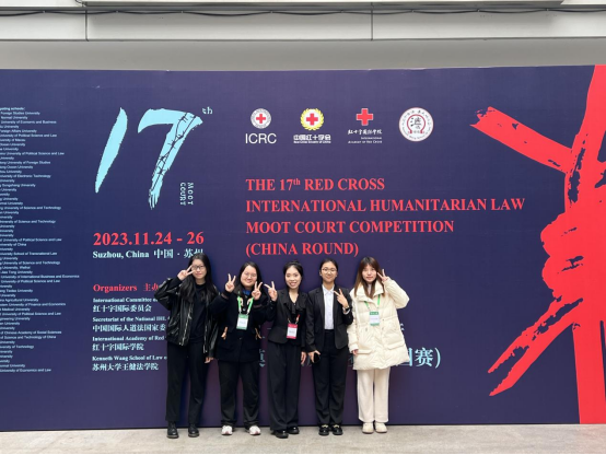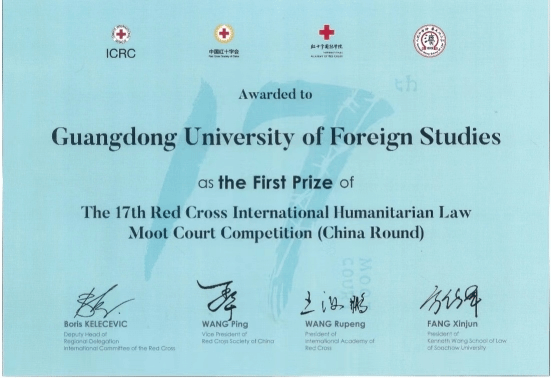 2023年11月24日,由红十字国际委员会、中国国际人道法国家委员会秘书处共同主办的第十七届红十字国际人道法模拟法庭竞赛(中国赛)在苏州大学举行。经过书状和法庭辩论阶段的激烈角逐,由广外法学院曾佟昕、林靖铱、刘妍彤、林慧言、黎淑莹五名学生组成代表队荣获全国一等奖。