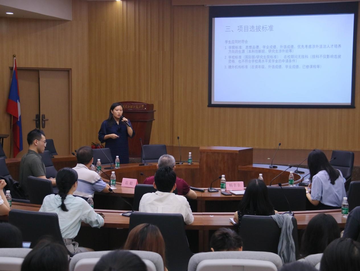 杨幸幸老师介绍了“视界行”访学项目的总体情况和选拔标准,对项目资助渠道和资助原则进行了详细解读。她提醒同学们要未雨绸缪,提前做好思想素质、专业基础和外语成绩等各项准备,珍惜并把握访学机遇,通过出国访学提升法学专业实践能力。