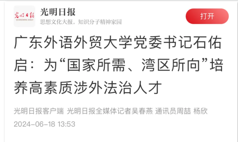 学院首设“小语种+法学”法律硕士,招收的首届学生顺利入学。组织完成“涉外法治”本科新专业申报。《光明日报》专访学校党委书记石佑启教授深入报道我校为“国家所需、湾区所向”培养高素质涉外法治人才的创新与实践及所取得的成效。