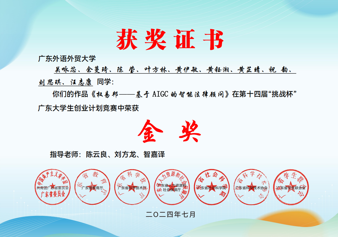10. 学生多项高水平学术竞赛获得全国一等奖,获全省优秀普法项目,获“挑战杯”广东大学生创业计划竞赛金奖,学生创业团队律师事务所在深圳开业