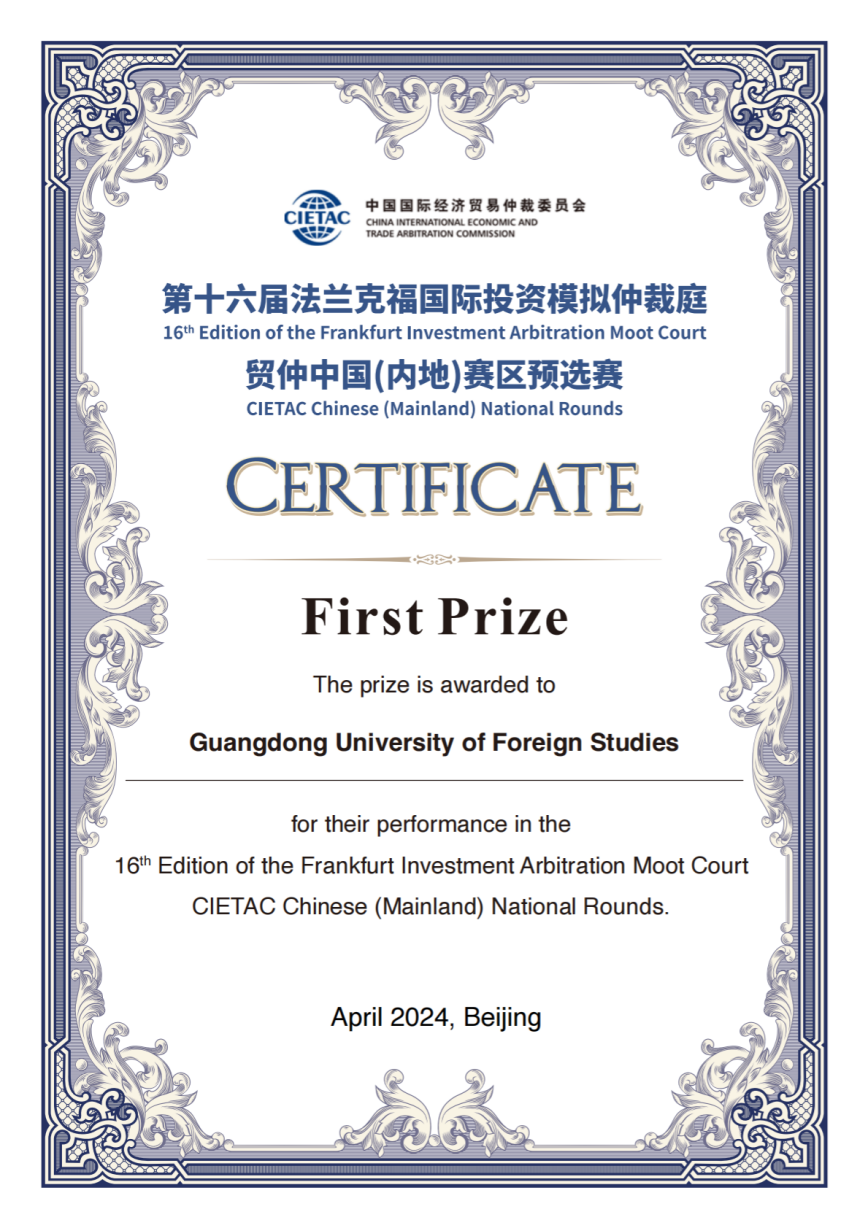 第十六届法兰克福国际投资模拟仲裁庭—贸仲中国(内地)赛区比赛一等奖
