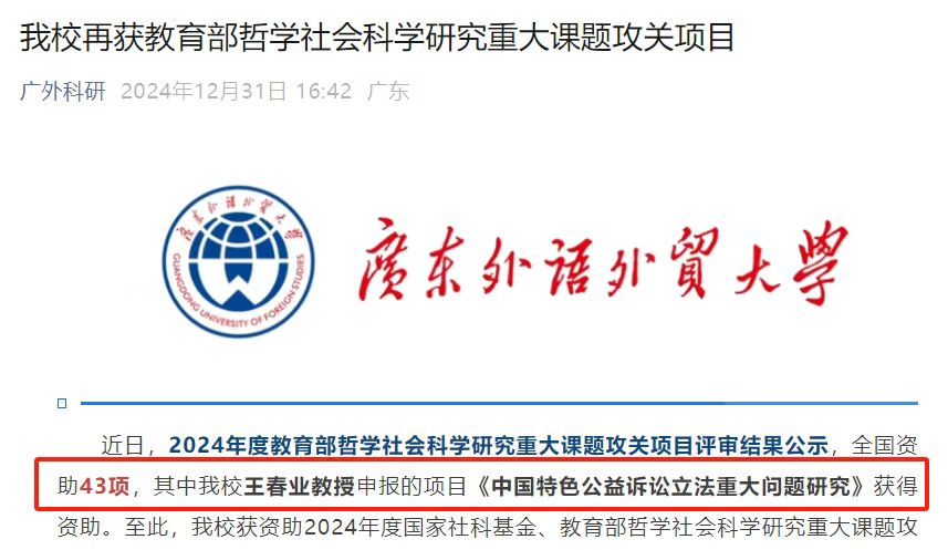 2024年,广外法学获得国家社科、省部级项目立项11项,在法学核心《中外法学》等期刊发表学术论文25篇,出版专著教材15部。王春业教授申报的项目获2024年度教育部哲学社会科学研究重大课题攻关项目立项。石佑启教授、杨治坤教授论文获教育部第九届高等学校科学研究优秀成果奖三等奖。任颖教授获国家社会科学基金后期资助项目立项,获得全国第九届高等学校科学研究优秀成果奖等教学科研奖励多项。依托云山著名教授论坛、云山法学大讲堂,举办学术讲座等20余场。30项研究报告被采纳批示,其中23项被中央或省部级相关部门采用或批示。