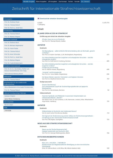 《国际刑法科学杂志》的前身是《国际刑法教义学杂志》(简称ZIS),是一本专注于德国、欧洲、国际与外国刑法与刑事诉讼法的德语学术期刊,在德语区内享有很高的声誉。通过开源出版,《国际刑法科学杂志》编辑部希望迎接全球化进程不断推进、多媒体网络日益普及的世界带来的挑战,尤其是对刑法领域的挑战。除了国内刑法之外,该杂志还将特别关注“刑法的欧洲化”、国际刑法以及外国刑法。