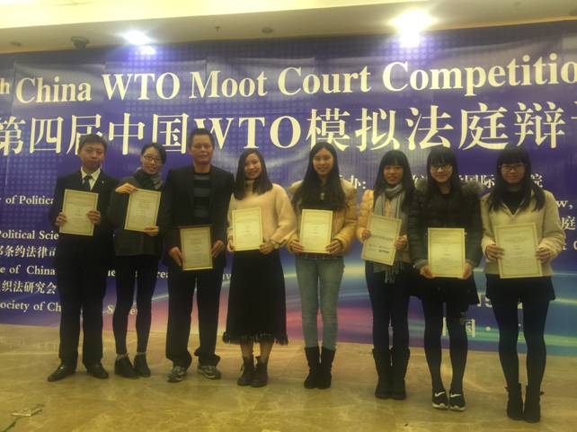 2015年12月11日至12日,正值中国加入世界贸易组织第14周年之际,2015年第四届中国WTO模拟法庭辩论赛在西南政法大学举行。本次大赛全程以全英模式进行,由西南政法大学、中国政法大学、中华人民共和国商务部条约法律司、中国法学会世界贸易组织法研究会主办,北大、武大、对外经贸大等多所国内知名高校参与。中国政法大学校长黄进,西南政法大学校长付子堂出席本次比赛开幕式并致辞,前国务院法制办副司长冯雪薇、前商务部世贸司处长穆忠和等专家担任本次比赛的评委。经过两日激烈的庭辩角逐,我校代表队表现出色,勇获大赛全国二等奖与“最佳辩手”奖。