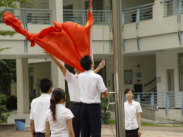 2009年10月1日早八点,广东外语外贸大学师生为庆国60周年举行庄严的升旗仪式。参加活动的有副校长陈子锐,学生处处长植秀聪,学生处老师毕建勇、陈哲、王新生,新闻学院团委书记商杰强,法学院团委书记郭嫄,以及法学院全体新生和各学院代表。