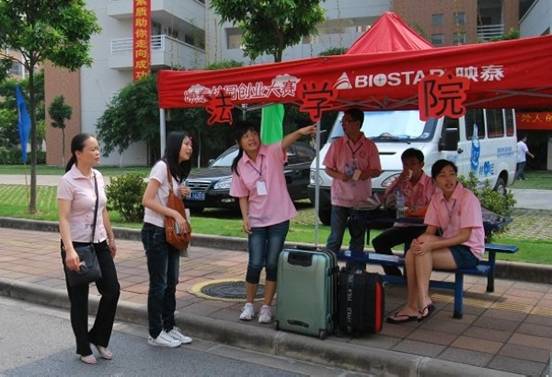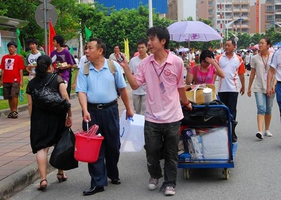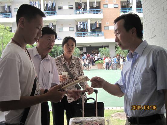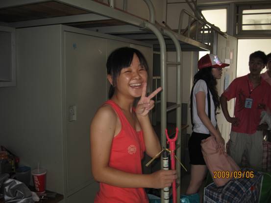 为了让新生尽快地适应新的环境,所有的工作人员都全力以赴地帮助小师弟小师妹。顶着炎炎烈日,他们为了接待新生,不停地拿着行李在校道、楼层之间来回走动。虽然汗水湿透了他们的衣服,但是一旦有新生需要帮忙,他们又义不容辞地走上前去,“在同一个学院里,我们就是一家人了,需要帮忙的话,尽管说出来!”这句话,道出了许多志愿者的心声。