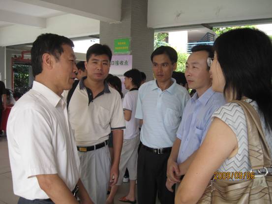 学校党委许国彬副书记(左一)询问迎新工作情况