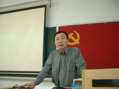 接下来是“书记寄语”。金良成书记入党近二十年,他提出毛主席的名言“人是要有点精神的”,并以“始终保持共产党员先进性”的发言与大家共勉。他给毕业生党员们讲述了两段历史,一段是“延安时期大批知识分子‘到延安去,到解放区’去成潮流”,一段是“建国初期大批留学生放弃欧美优厚待遇坚决回国”,说明“不同时期对党员先进性的要求是不同的”。他说现阶段国家号召大学生到西部去,到基层去,那里的条件虽然艰苦,却有着大学生实现自我价值、为事业奋斗、创造人生壮丽篇章的舞台。他期望毕业生党员们择业时都能胸怀祖国,放眼世界,像当年的知识分子、留学生一样,成为当代“中国的脊梁”。