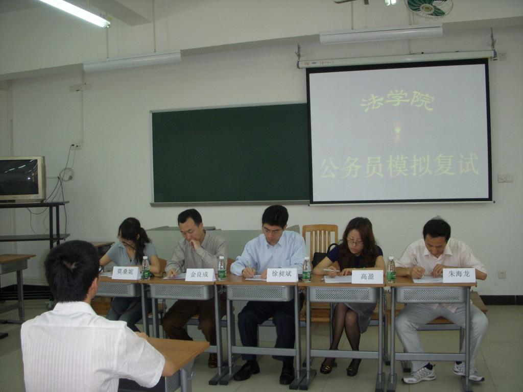 法学院高度重视并认真组织本次活动,从考场布置、考题设置、侯考面试等完全按照公务员面试环节进行,并邀请到就业指导中心副主任徐昶斌、法学院党委书记金良成、05级辅导员朱海龙、08级辅导员高盈以及刚通过09年国家公务员考试的莫桑妮同学担任主考官。