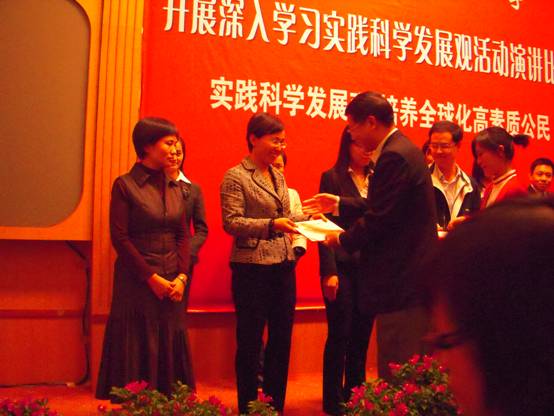 老师为这次比赛做了总结,她表示,这次演讲给她留下了深刻的印象,把她从欧洲研究的视角拉回了中国,“实践”一词用得最为妥当最为贴切,高度概括了科学发展观深厚的理论内涵,而选手们在形式和内容上的多样化和崭新的视角更是把这次演讲推到了高潮。她对选手们的表现都作了高度的评价。其中法学院