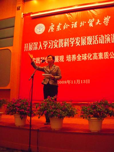 为响应党中央提出的科学发展观的口号,我校以举办演讲比赛的方式开展了深入学习实践科学发展观的活动.11月13日下午,围绕着“实践科学发展观,培养全球化高素质公民”这一主题思想的演讲比赛在北校区行政楼国际会议厅拉开了序幕。