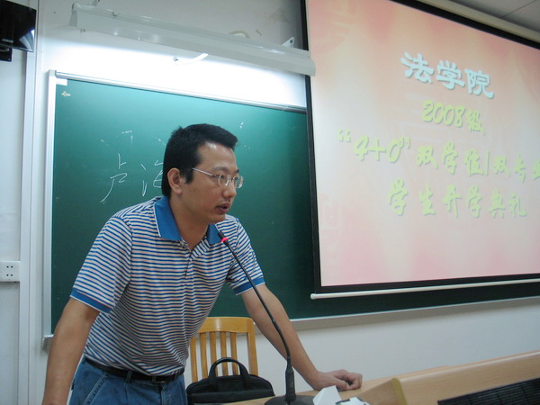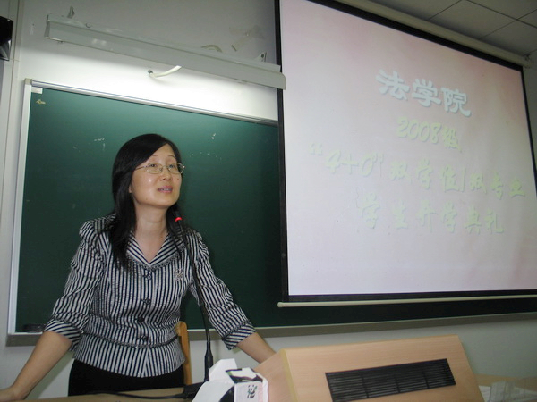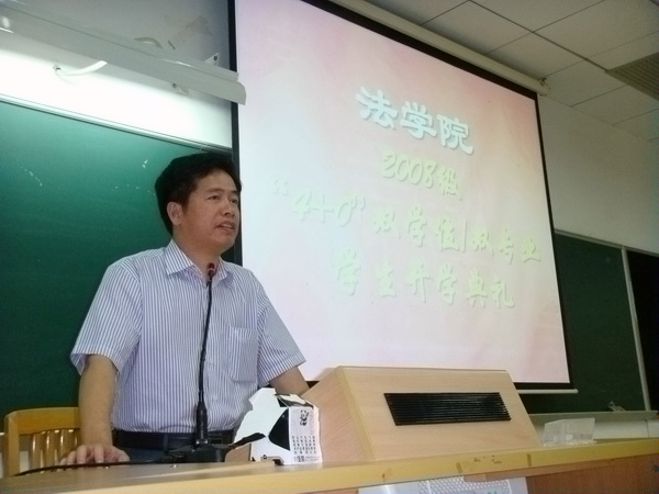 10月7日晚,法学院2008级“4+0”双学位/双专业学生开学典礼在南校区教学楼F307召开。法学院党委书记金良成、院长蔡镇顺、党委副书记卢海清及副院长黄丽萍出席了本次典礼。