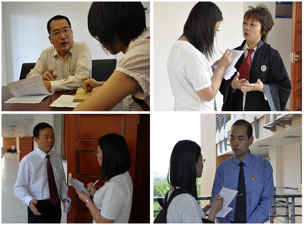 庭审结束后,本网记者对审判长蔡穗硕进行了采访。被问及在判刑时作了哪些方面的考虑时,蔡穗硕表示,为了使量刑规范化,一般会在量刑时考虑被告的主观恶性、作案手段、认罪态度、是否愿意赔偿以及对公众的影响等。其中,被告是否愿意赔偿对量刑结果尤为重要。而对于同学们很关心的“在大学期间应如何更好地将法律知识运用到实践中”的问题,蔡穗硕则建议我校可以借鉴华南理工大学法学院的做法,与法院合作开办法律学习班,为学生提供一个把理论运用到实践中的平台。现在国家的“十二五”规划正在开展,作为法学学生,该如何调整自身的定位才能更好地与此次改革契合?蔡穗硕认为,学生最重要的就是学好课本知识,摆正自己的心态,以后不管去哪里工作,都要相信天道酬勤。就法学学生就业压力的问题,审判长结合自身人生经历谈道,就业除了靠少许运气外,最主要还是个人素质和努力程度;他还鼓励有条件的毕业生进行自主创业。