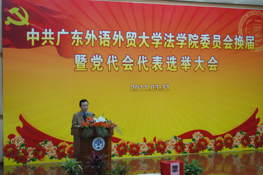 根据学校党委的相关工作安排,3月31日下午,法学院党委在南校区图书馆报告厅隆重召开了学院党委换届暨中共广东外语外贸大学第三次党代会代表的选举大会,我校党委常委、副校长石佑启、法学院党委书记金良成、院长蔡镇顺出席了大会,法学院全体教工和学生正式党员作为代表参加了大会,法学院前党总支书记杜元庭、校工会副主席黎家勇、学院预备党员代表、团学干部代表列席了会议,会议由学院党委副书记卢海清主持。