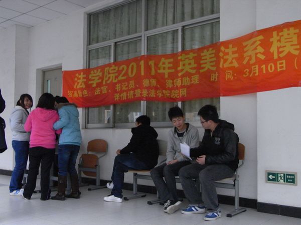 本网讯(文字:陈瑾 林韦因 摄影:李怡忆) 3月10日,法学院2011年英美法系模拟法庭第一轮成员招募在G108举行,本次招募对象为法官、律师、律师助理、书记员。现任学生主席王岳湘、学术部部长邱俊敏、上届学生会主席袁社灿和学术部部长郭璐琛、副部长陈暹华以及上届模拟法庭成员周灿丰担任了活动的评委。