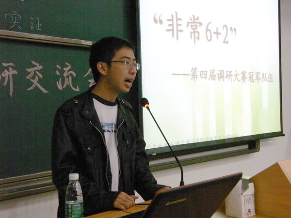 上届冠军队队员林思哲则与大家分享了自己参赛的经验。他特别提出要注意组队时队员的层次性,最好包括高低年级、不同专业的同学;另外他还简单地介绍了做调研的步骤和撰写调研报告的方法。在与同学们的互动时,他强调要注意时间的利用,特别是寒假时间,以及要根据队员的特长做好分工。