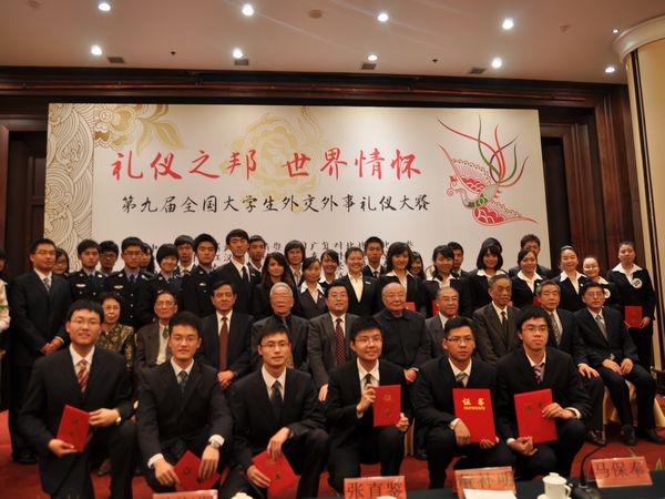 本网讯(文字:丘钰萱 摄影:王智鑫 佘爽) 10月30日,由外交学院主办、全国20所高校协办,以“礼仪之邦,世界情怀”为主题的第九届全国大学生外交外事礼仪大赛在北京钓鱼台大酒店隆重举行,来自北京大学、复旦大学、国际关系学院、武汉大学、厦门大学等全国各地20所高校的大学生参加了本次比赛。经过预赛与总决赛的激烈角逐,外交学院获得本次比赛冠军。由我校选派的来自法学院08级的王智鑫、陈晓鹏、邢瑾、佘爽及丘钰萱等五名同学,在法学院党委副书记卢海清、法学院团委书记朱海龙及外交外事礼仪专家范洪颖等指导老师的认真培训下,经过数月来的悉心准备,在比赛中凭借出色发挥,获得了三等奖的优异成绩。