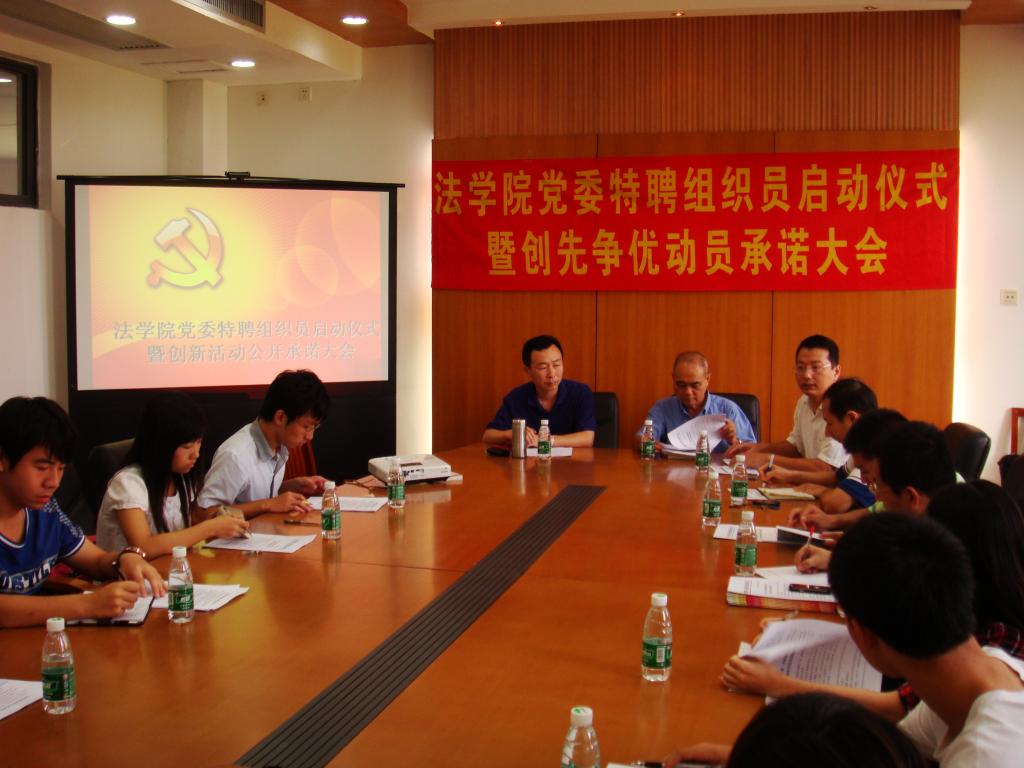 (文字:姚震乾 图片:姚震乾)2010年9月29日早,法学院党委特聘组织员启动仪式暨创先争优动员承诺大会在南校区院系楼404会议室召开。本次会议,一方面是法学院党委邀请到校党委特聘组织员冯益谦教授,为与会的学生党员干部对上级党委有关争先创优活动的精神进行辅导,另一方面也是法学院党委部署争先创优活动承诺阶段的重要会议。法学院党委书记金良成,副书记卢海清,各年级辅导员老师及各支部委员、党员代表出席会议,会议由卢海清主持。