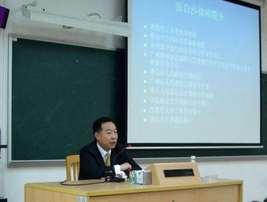 本网讯 4月8号下午2时整,香港理工大学客座教授、暨南大学国际学院兼职教授张白沙先生莅临广外,进行了一场时长3小时的讲座。表面严肃端庄的张律师却表现得幽默诙谐,令在场听众为之拍手叫绝。