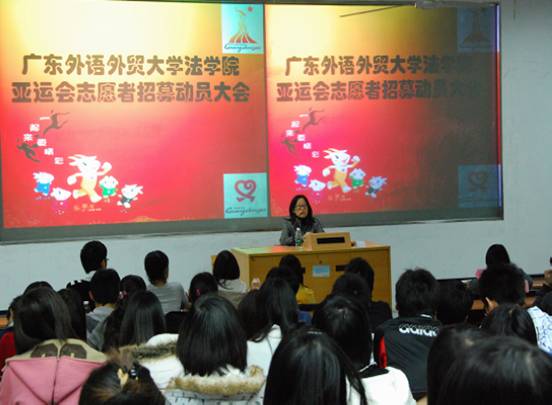 本网讯 2010年3月26日18:30分,为了响应2010年广州亚运会志愿者“在一起,更精彩”的号召,以及鼓励更多的学生积极投入到广州亚运会志愿者队伍中,法学院08级在E204举行了广东外语外贸大学法学院亚运会志愿者招募动员大会。