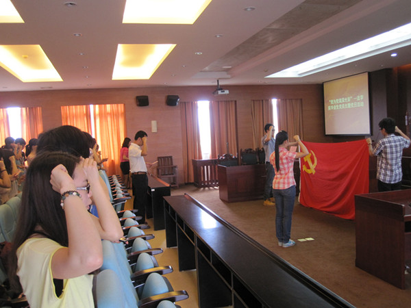 卢书记讲话后,毕业生党员中新近的一批,也是2012届最后一批发展的预备党员同志,在老党员的带领下,面向党旗,庄严宣誓。