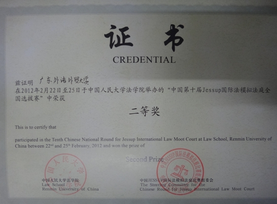 昨日,广东外语外贸大学代表队从第十届JESSUP国际法模拟法庭比赛载誉归来!在全部37支参赛队伍中,名列第十,荣获团体二等奖。此外,我校还第一次荣获单项奖——最佳表现奖,创造了我校参赛以来的最好成绩。