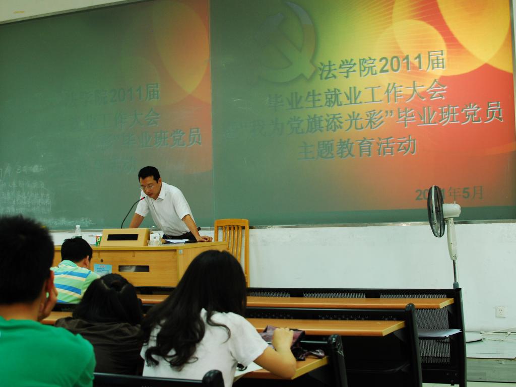 本网讯 2011年5月25日下午3时,法学院2011届毕业生就业工作大会暨“我为党旗添光彩”毕业班党员主题教育活动于E204召开。参加会议的有就业指导中心的许俊浩老师,法学院党委副书记卢海清,以及潘高峰、高盈老师。会议由卢海清主持。