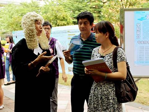此外,法学院团学积极为本次招生宣传做好工作。热情活跃的团学工作者积极向前来咨询的人派发传单,身着法袍和律师袍的模特更是吸引了不少目光。