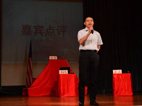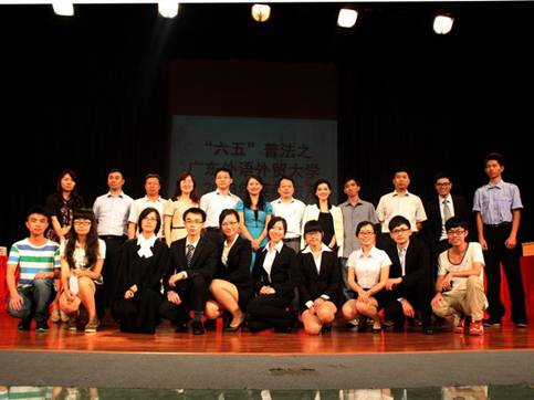 本网讯(文字:王灏 摄影:张恺茵 刘滢 编辑:吴惠敏) 2013年5月20日晚,“六五”普法之广东外语外贸大学2013年英美法系模拟法庭公演在B8学术报告厅举行。出席此次公演的嘉宾有校党委宣传部部长胡文涛,校党委宣传部副部长杨冬生,法学院副院长黄丽萍,法学院党委副书记卢海清,广东法制盛邦律师事务所律师刘长久,模拟法庭指导老师刘晓蔚,法学院09级辅导员朱海龙老师,法学院副教授杨桦还有法学院团委书记刘青老师。