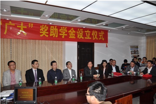 2013年4月8日下午,法律硕士教育中心“广大”奖助学金设立仪式在北校区法律硕士教育中心会议室顺利举行。广大律师事务所主任薛云华律师、执行合伙人李光辉、王浩晖、陈作科等律师及广东外语外贸大学法学院金良成书记、院长蔡镇顺、法硕中心主任常廷彬、研究生办公室主任叶昌富及广东外语外贸大学教育发展基金秘书处谢伟光秘书长等出席了设立仪式,此设立仪式由常廷彬主持,蔡镇顺、薛云华、谢伟光、杨晨代表各自的单位和受赠学生在设立仪式上讲话。