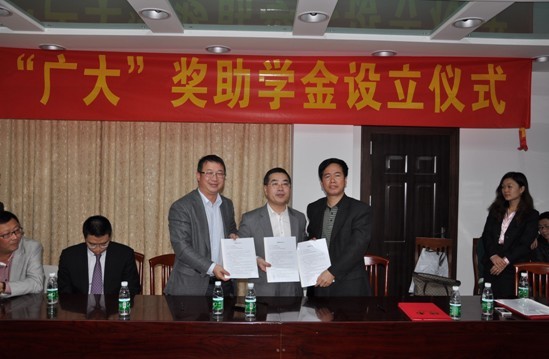 在“广大”奖助学金设立仪式上,法学院院长蔡镇顺、广大律师事务所主任薛云华及广外教育基金发展秘书处秘书长谢伟光签订广大与广外法学院的三方合作协议,由此,双方的合作全面展开。