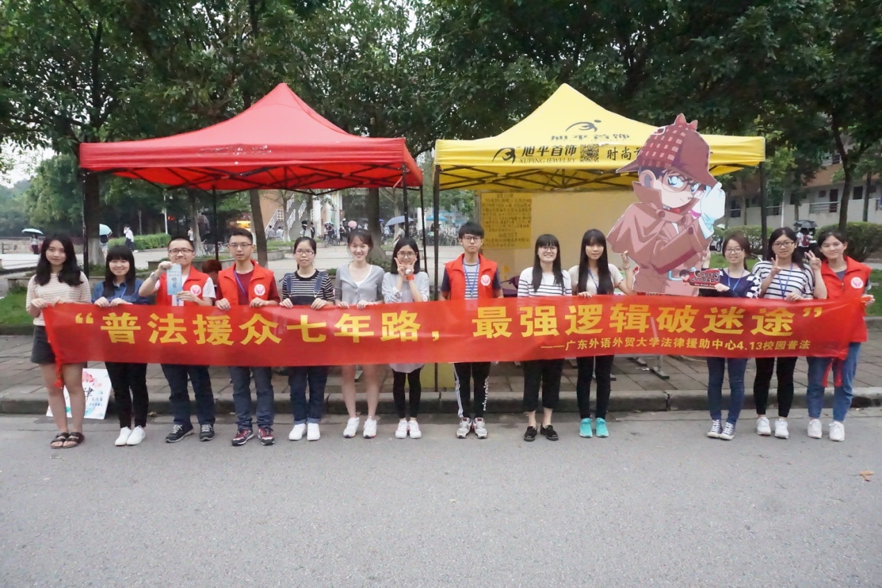 本网讯(文字:方玉琳 摄影:方玉琳)2016年4月13日,广东外语外贸大学法律援助中心(以下简称“广外法援”)于成立七周年之际在校内进行了摊位普法。此次活动旨在为临近毕业的同学普及劳动法、劳动合同法的法律知识,使同学们在求职时懂得运用法律维护自己的权益。同时,法援的七周年活动“最强逻辑”断案推理大赛在即,广外法援也在现场进行了相关宣传。