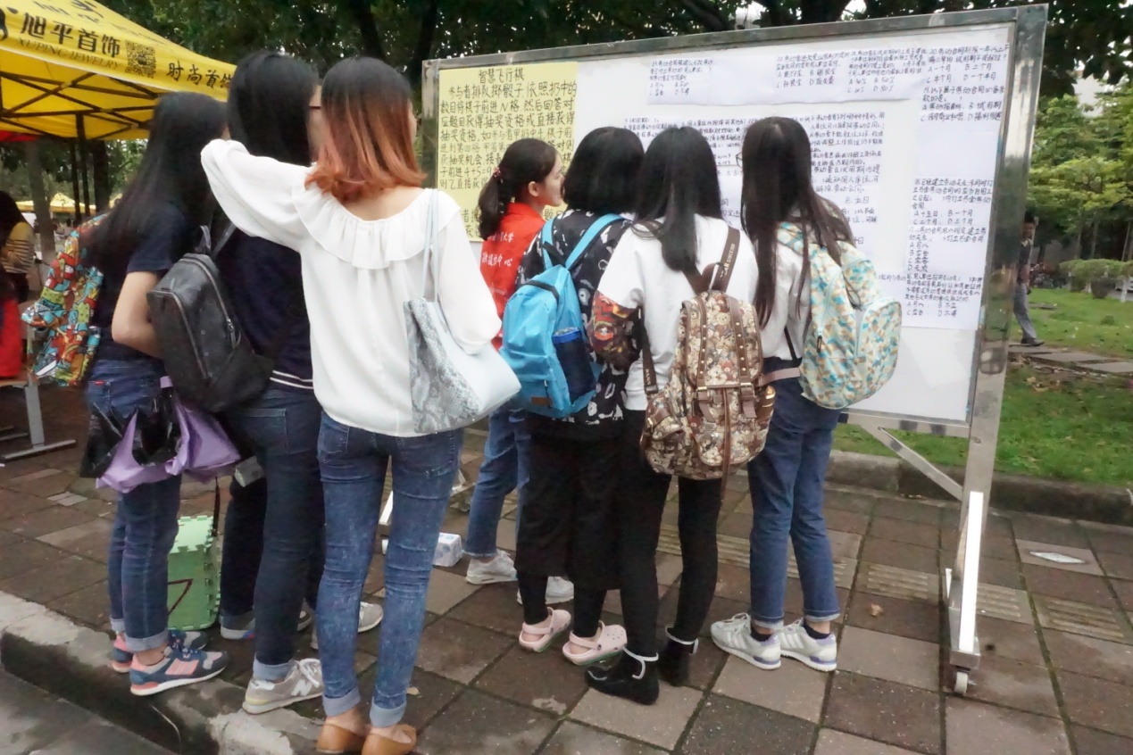 游戏环节中,志愿者设计了摇色子答题和抽纸答题两个游戏,答对题目便可抽奖,获得精美礼品。游戏题目多涉及到同学们求职中常见的问题,如劳动合同中试用期、工资的相关规定,这使得参与者在游戏中得以掌握到与自身利益相关的法律知识。同时,不少同学也被最强逻辑断案推理大赛的宣传所吸引,对大赛表现出浓厚的兴趣,前来咨询报名方式。