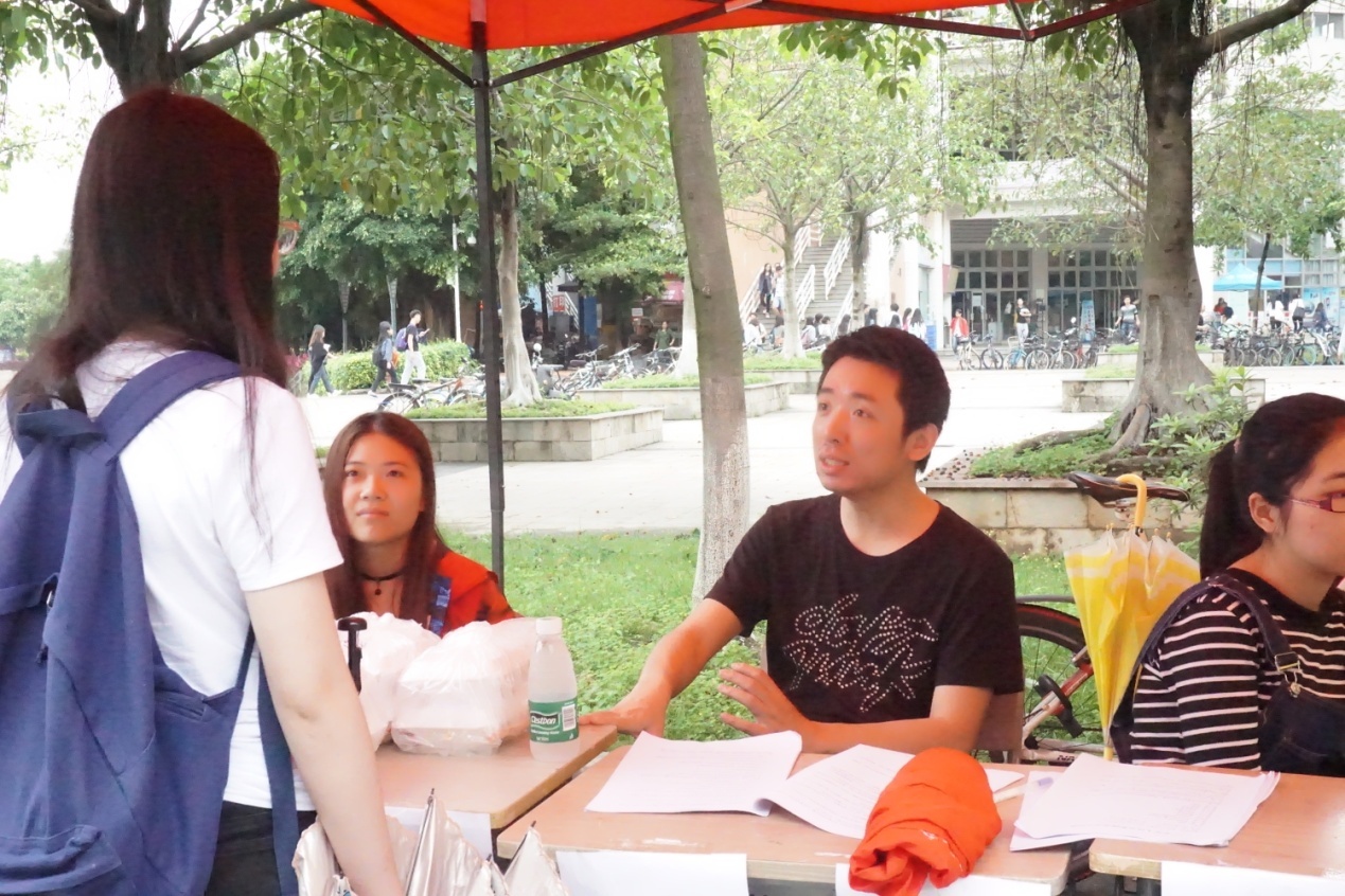 上午11点,天气放晴,法援志愿者已经布置好摆摊现场。此次活动的主要形式是接受法律咨询、举行答题游戏及派发普法宣传资料。摊位刚布置完毕,就有同学前来摊位咨询疑难。其中有路人对房屋继承纠纷的问题提出疑问,也有同学对代购风险、关税等问题十分关心,而志愿者都一一予以解答。