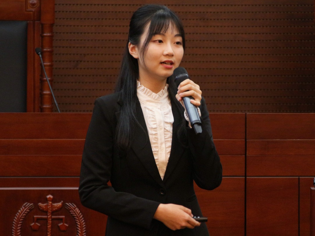 第二位展示的是15国经一班的潘弘嘉。她将日语兴趣和法律专业结合起来,志在成为一名中日涉外律师。她分别从自身兴趣、性格和技能方面进行内部分析,再从家庭、学校、社会和职业本身进行外部分析,使评委和观众对她有全面而清晰的认识。在嘉宾提问环节中,面对“作为律师,如何把经济利益和法律公益结合起来”这一问题,潘弘嘉认为,律师也可以从事法律援助,追求经济利益和法律公益二者之间并不矛盾。评委对她流畅的口头表达、丰富的实习经验和对职业前景的深度了解给予了高度的赞扬。