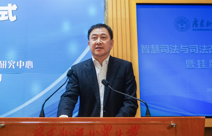 隋广军在致辞中指出,当前以“大数据”“云计算”“人工智能”“移动互联网”等为代表的新一代互联网技术飞速发展,对经济社会发展产生了深刻影响,而探索和创新新技术应用于司法领域,对顺应国家司法体制改革,推进全面依法治国,促进国家治理体系和治理能力现代化具有重要作用。他强调,研究中心的成立贯彻了党的十九大提出的习近平新时代中国特色社会主义思想,适应了广东省肩负的历史使命和重大战略需求,应运而生,正逢其时。此外,他回顾了我校依法治校、构建现代大学治理体系的探索历程及成果,并对我校支持全面推进依法治省、服务法治广东建设所做的工作及取得的成绩作了介绍。他表示,我校将全方位支持中心的建设,并希望与各方一道,为司法改革创新发展贡献力量。