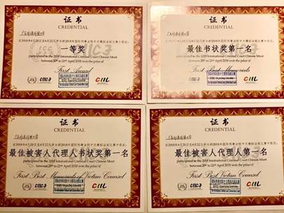 本网讯(文字:赵梓彤 摄影:庄梦碟)2018年4月19日至22日,第五届国际刑事法院模拟法庭比赛在中国人民大学如期举行。在本次赛事中,由我院林茂辉副书记、陈少青、杨浩楠、修文辉、杜晓君和梁彤老师的担任指导、培训老师,李峻铭、庄梦碟、郭子琪、周雅婷、孙思源、郭淳、范晗、赵梓彤、张琳等九名本科生组成的队伍,斩获了综合一等奖、最佳书状奖第一名、最佳被害人代理人第一名和最佳被害人代理人书状奖第一名四项全国性奖项,创下了广东外语外贸大学代表队参赛以来的最好成绩,展现了我院在法学专业人才培养的优势和实践教学水平。