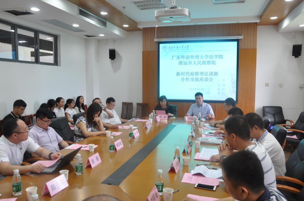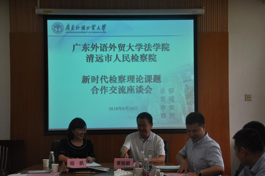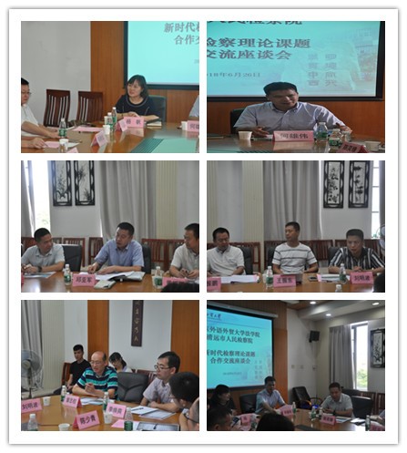 6月26日上午,广东省人民检察院、清远市人民检察院一行9人到广东外语外贸大学法学院,就深入推进“检校”合作与课题共建等方面进行交流。出席此次座谈会的分别有:广东省人民检察院公诉一处副处长何雄伟、公诉二处科长王晖、公诉三处科长陈奕锋;清远市人民检察院副调研员邱亚军、公诉科科长黄振鹏、副科长王振东、副科长刘明波;清远市清城区人民检察院科长曾志权、干警季焕爽;法学院副院长杨帆、教师代表与研究生代表。会议由杨帆主持。