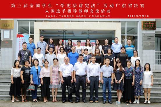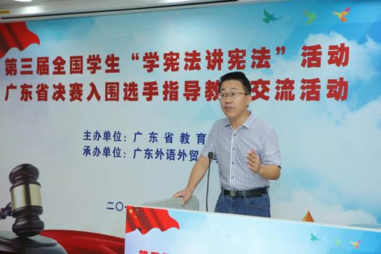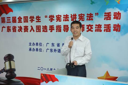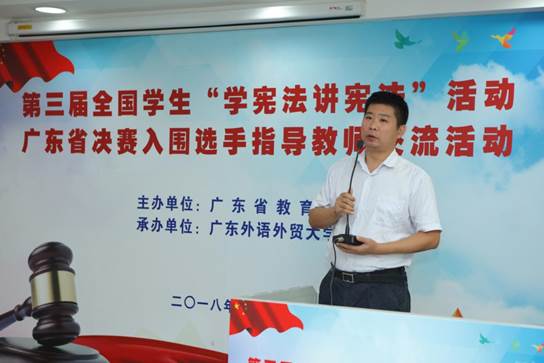 本网讯(文字:沈铮 摄影:晏婧 网编:何宝莹) 9月8日,第三届全国学生“学宪法 讲宪法”活动广东省决赛入围选手指导教师交流活动在我校北校区顺利举行。出席活动的领导和嘉宾有广东教育厅政策法规处戴庆洲副处长、尹国胜副主任科员,广东外语外贸大学广东省地方立法研究评估基地常务副主任朱最新教授、潘高峰副教授、晏婧老师。潘高峰副教授和广东省委党校谢青副教授作了专题交流培训。