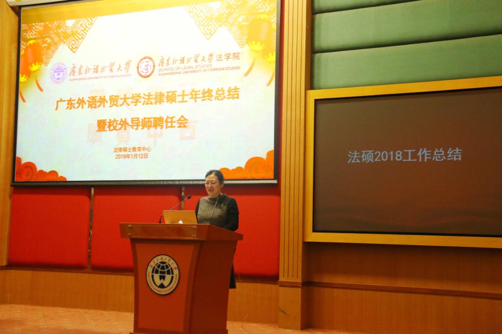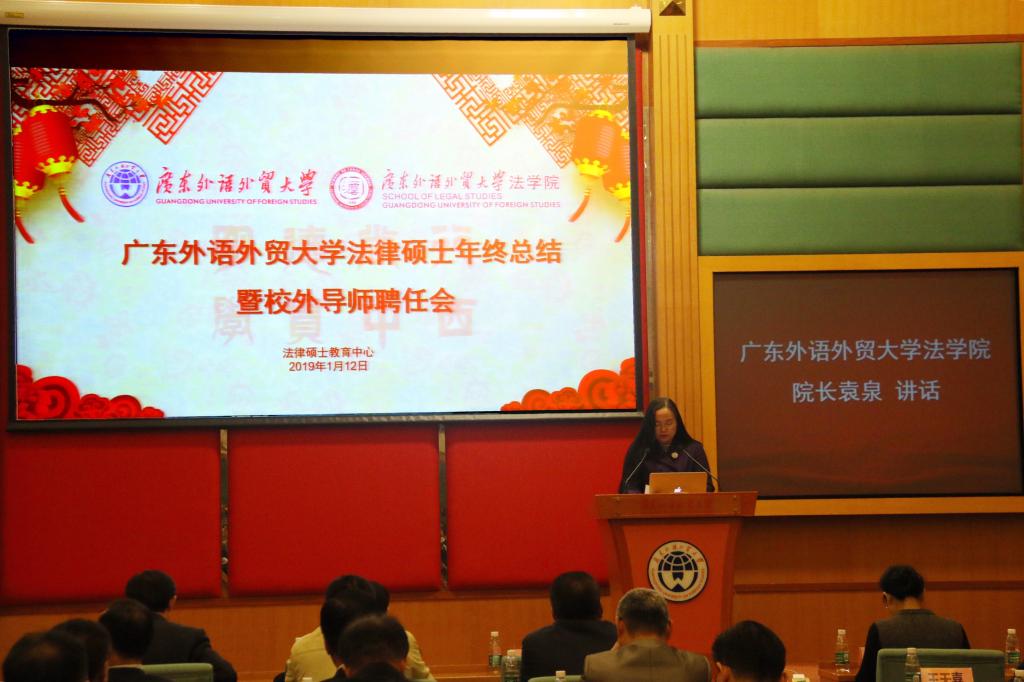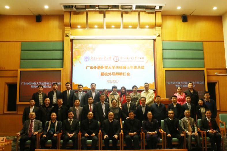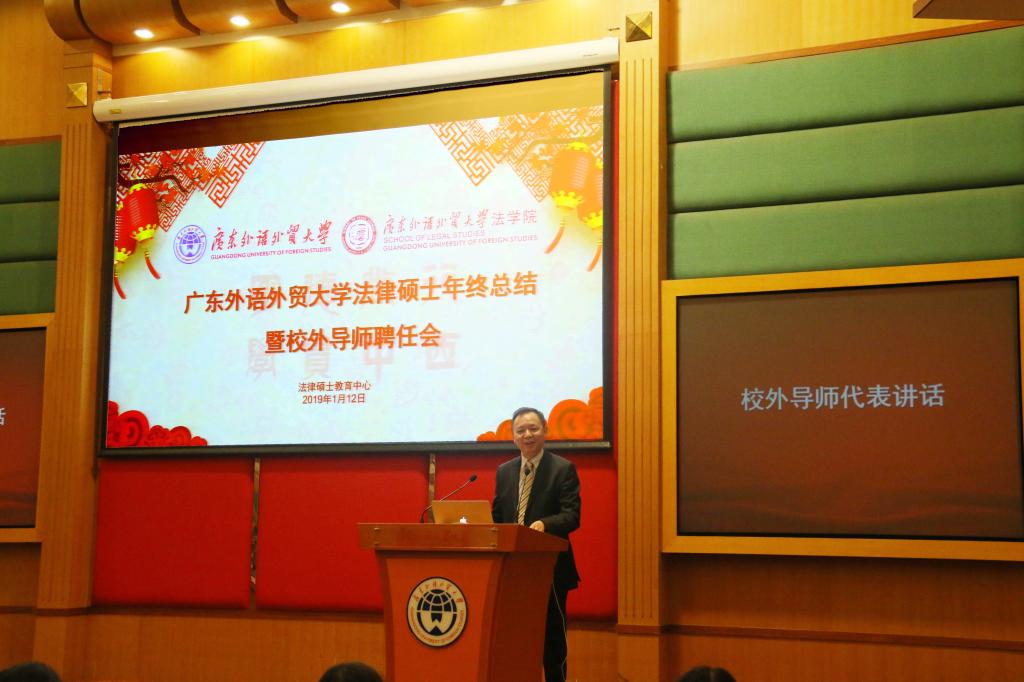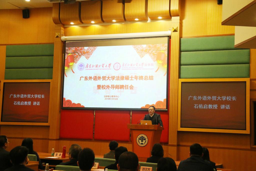 1月12日下午,广东外语外贸大学法律硕士年终总结暨校外导师聘任会在北校区行政楼国际会议厅隆重举行。广东外语外贸大学校长、党委副书记石佑启,法学院党政班子成员,法律硕士教育中心主任杨桦出席大会。来自各级人民法院、检察院、律师事务所等法律实务界的校外实践导师代表、法律硕士校内导师代表和法律硕士研究生代表参加大会。大会由法学院副院长韩永红主持。