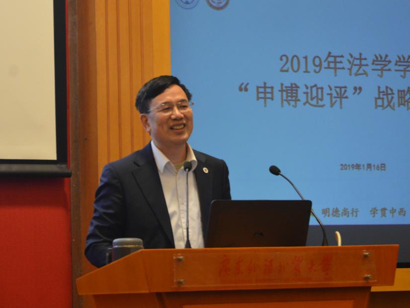 1月16日下午,在北校区行政楼国际会议厅隆重召开2019年广外法学学科“申博迎评”战略研讨会。出席此次会议的有我校副校长何传添、研究生院院长胡文涛、云山杰出学者陈云良、法学院党委副书记、院长(华南知识产权研究院院长)袁泉、法学院党委书记王则唐、土地法制研究院院长陈小君、广东省地方立法研究评估与咨询服务基地主任朱最新、法学院副院长杨帆、法学院副院长耿卓、法学院副院长韩永红以及来自法学院和三所研究机构的诸位教师和科研人员。