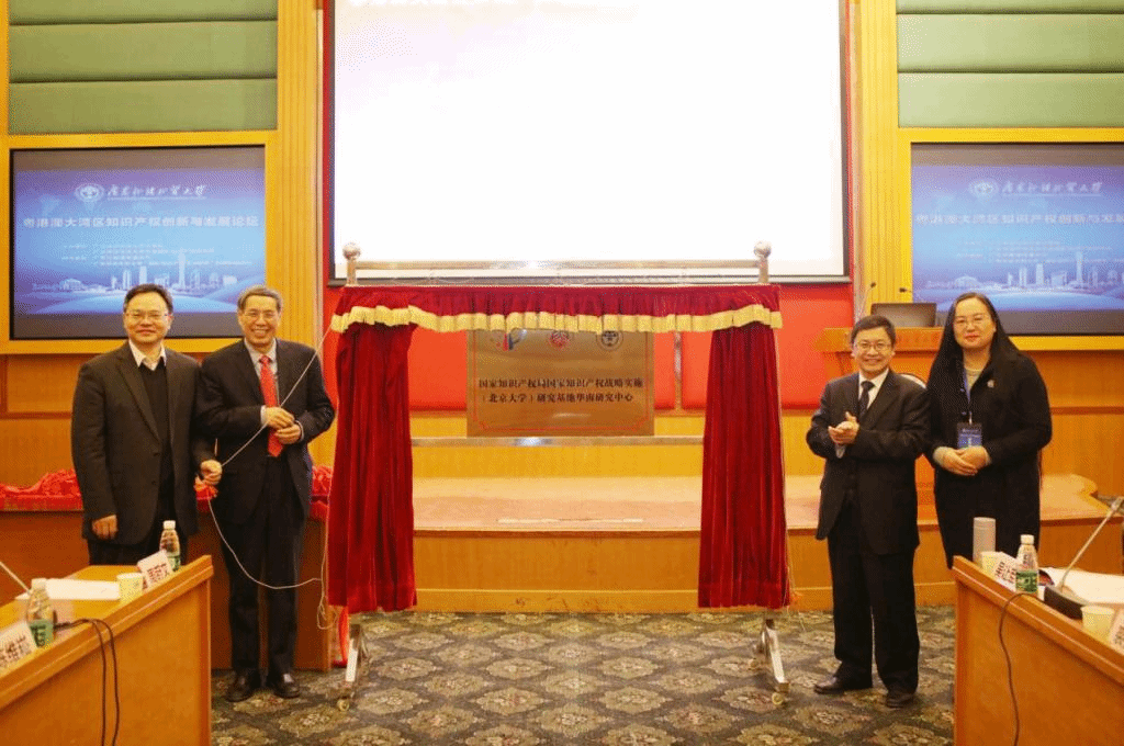 之后举行国家知识产权战略实施(北京大学)研究基地华南研究中心的揭牌仪式。易继明教授首先对华南研究中心做了介绍。随后,刘建达校长、吴汉东教授、易继明教授与袁泉院长共同为中心揭牌。