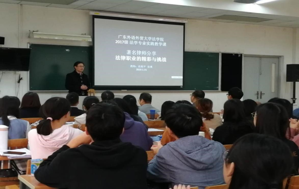 2019年1月15日下午,法学院本科教学实践交流活动在大学城校区教学楼E座举办,邀请了广东海际明律师事务所刘玉国主任、何富杰书记和练美华、林武、管莹等高级合伙人及资深律师,他们以法律职业的精彩与挑战为主题,为法学院师生们分享他们的职业经历以及对法律事业的感想。本次活动由法学院范利平、张爽老师牵头组织,法学院民商1702和知产1701班的同学以及部分硕士研究生参加了交流会。
