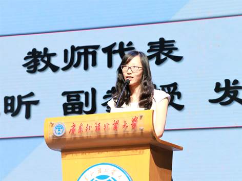 随后,教师代表卢纯昕谈了她对新生的三点希望与期待。第一,学生要坚持锻炼、磨练心志以适应学习与工作中遇到的挫折与困难,完成人生的蜕变;其次,学生在学习生活中要抓住机遇、接受挑战,多多参加学术类竞赛来提升自己;另外,她也希望新生能够珍惜师生情、同窗情,不忘初心,最终收获从容与快乐。