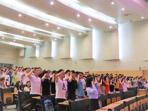 到了新生宣誓环节,全体新生起立,对自己、对学校、对国家与社会许下庄严的承诺。会场灯光熠熠,却湮灭不了新生们坚定的目光,那铿锵有力的声音正努力褪去青涩,彰显着新生们努力学习、回馈母校、报效祖国的决心。