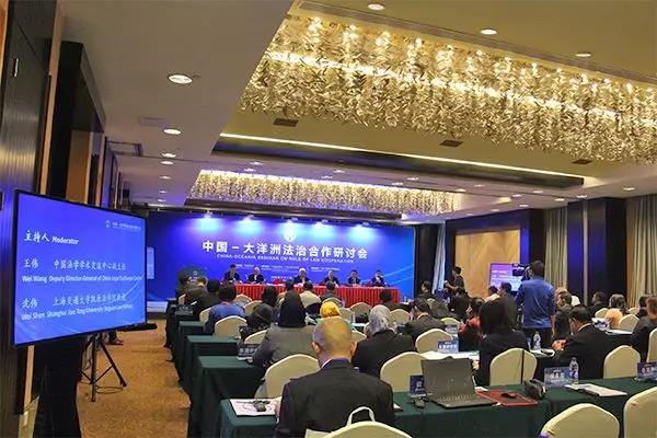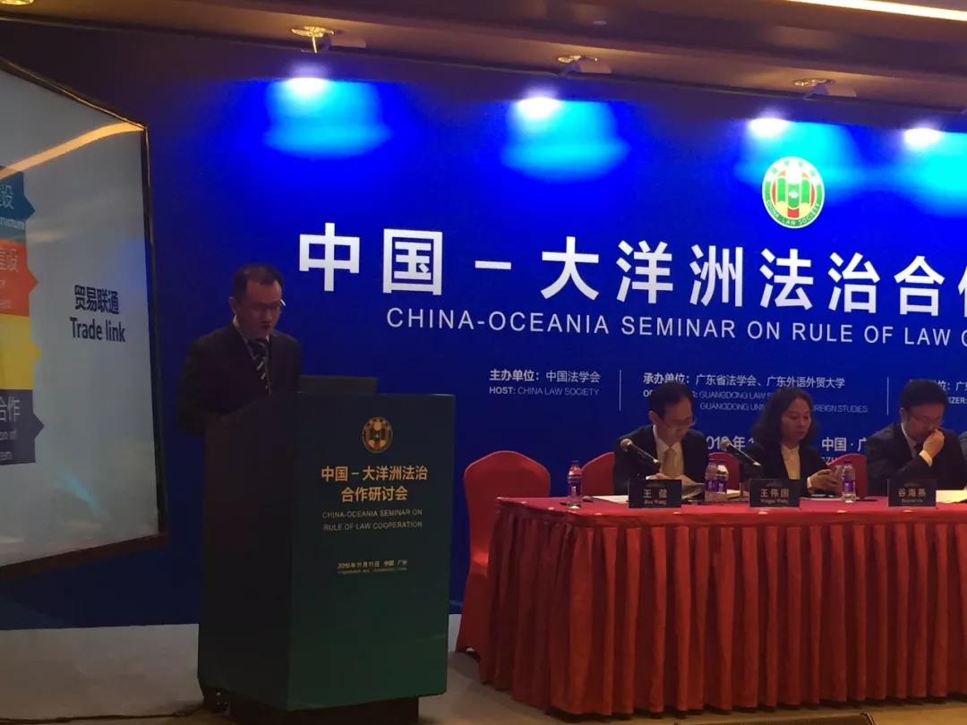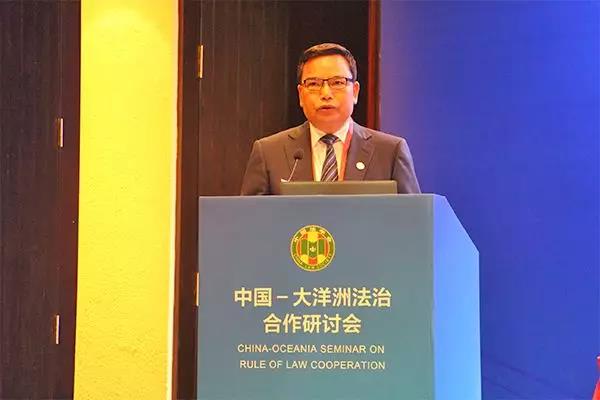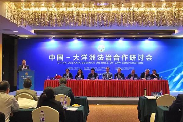 11月11日上午,“中国——大洋洲法治合作研讨会”在广州举行。研讨会由中国法学会主办,广东省法学会、广东外语外贸大学承办,广东广信君达律师事务所协办。本次研讨会是中国法治国际论坛(2019)的边会之一,聚焦研讨中国与大洋洲国家之间法治合作。中国法学会党组书记、常务副会长陈训秋出席研讨会。萨摩亚前首席大法官帕图•法莱法图•马卡•萨波卢,斯里兰卡首席大法官贾扬塔·贾亚苏里亚,密克罗尼西亚联邦总统司法顾问、前司法部长乔希斯·盖伦、司法部助理总检察长约瑟芬•约瑟,瓦努阿图司法和社区服务部长邓·肯、第一政治顾问马洛肯·阿利里,萨摩亚驻华大使塔普萨拉亚·图玛塔、大使夫人西尔沃瑞娜·图玛塔,东盟法律协会菲律宾国家委员会副主席雷吉纳·杰拉尔德兹等外国来宾出席本次会议。