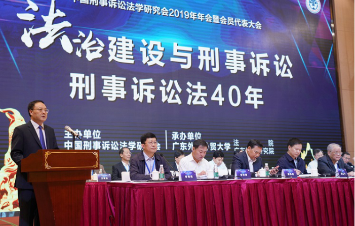 石佑启表示,党的十九届四中全会胜利闭幕,提出坚持和完善中国特色社会主义制度、推进国家治理体系和治理能力现代化的总体目标,为推进全面依法治国指明了方向,作出了战略部署。中国刑事诉讼法学研究会2019年年会在此时召开,意义重大。选择此地召开,是对我校的信任与支持,对广外特别是法学学科的发展与建设具有非常重要的意义。近年来在社会各界的关心和支持下,广外法学学科建设取得长足进展。广外将以本次会议的召开为契机,进一步强优势、补短板,在新一轮学科评估和学位点申报中提档升位、争创佳绩。  卞建林致辞